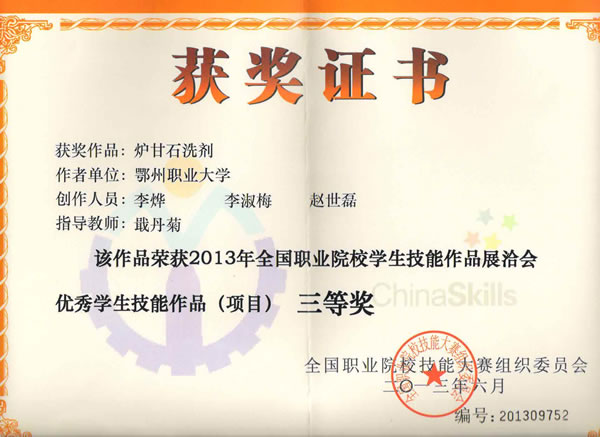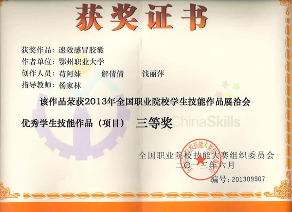 经过参展会专家认证,由杨家林副教授指导的“炉甘石洗剂”和戢丹菊教师指导的“速效感冒胶囊”两项作品,均荣获2013年全国职业院校学生技能作品展洽会“优秀学生技能作品(项目)”三等奖。