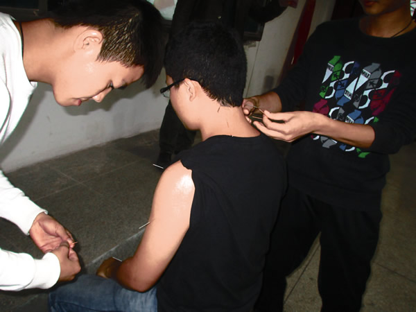 杨老师围绕针灸的理论与发展这个主题,以浅显易懂的语言,从针灸的产生、经络腧穴理论的形成、历史的演变、现代技术的创新、当今世界的发展及大医精诚的奥义等六个方面,详细阐述了针灸技术的魅力和从医者所需具备的品格。在讲座过程中,杨老师还邀请了在场的几位同学上台体验了一下针灸治疗的感受,并观摩了颈椎病及膝关节退行性病变的针灸治疗过程。讲座结束后,杨波老师对同学们的问题做出了解答。并且,他希望在下学期继续推出关于推拿、火罐、刮痧、艾灸等系列讲座。