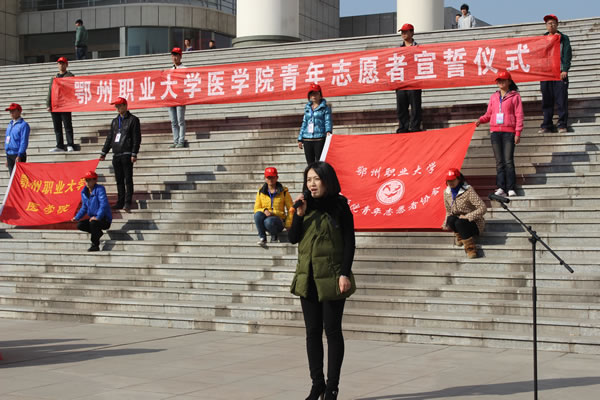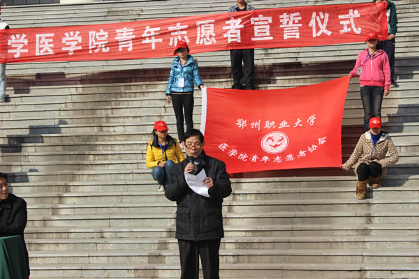 2013年11月28日下午2时,我院青年志愿者协会在求真楼广场前组织“2013级青年志愿者宣誓仪式”。 医学院党总支书记汪艳霞、党总支副书记徐宏伟、院青协结对帮扶单位的领导莅临活动现场,2013级青年志愿者代表500余人参加了本次活动。