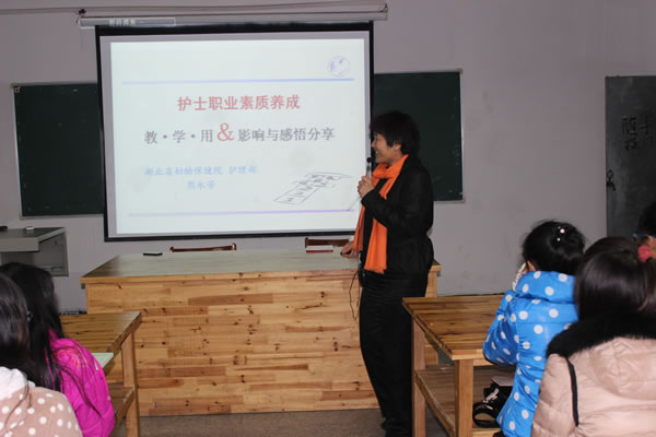 仪式结束后,熊主任马上投入工作中来,随即对我院的护理、助产专业的老师和学生开展了一场《护士职业素质的养成》的专题讲座,从护生的素质要求、能力要求、形象要求等方面讲述了如何培养护士的职业素质,并提出在教学过程中教师与学生彼此间要经常进行情感交流,从而达到共识、共享、共进,实现教学相长。讲座过程中参与的院师生积极参与互动,气氛热烈。聆听讲座的师生纷纷表示,收益颇多。