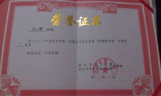 我院护理专业实习生徐小静和刘华丽参加了武汉市第一医院实习护生首届“护理操作秀”比赛,在比赛中她们以过硬的技能在参赛的众多实习生中脱颖而出,表现出众。徐小静同学荣获一等奖,刘华丽同学荣获二等奖,为校争光。