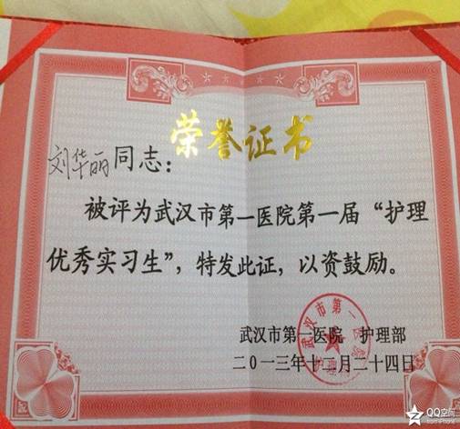刘华丽、王串两位同学荣获武汉市第一医院“2013年度优秀实习生”荣誉称号
