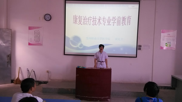 黄老师首先通过一段视频“我们骄傲,我们是康复治疗师”来激发学生的专业荣誉感和责任感,然后简单介绍了什么是康复、什么是康复医学、什么是康复治疗技术、什么是康复治疗师,接着重点介绍了我院康复治疗技术专业,包括专业概况、专业人才培养目标、专业岗位群、专业核心课程设置、专业教学条件、专业教学团队、专业社会认可度、专业的办学特色,专业就业明星,最后由一段工作于不同岗位群的历届毕业学生代表录制的视频“学弟学妹们,我想对你说......”结束讲座。