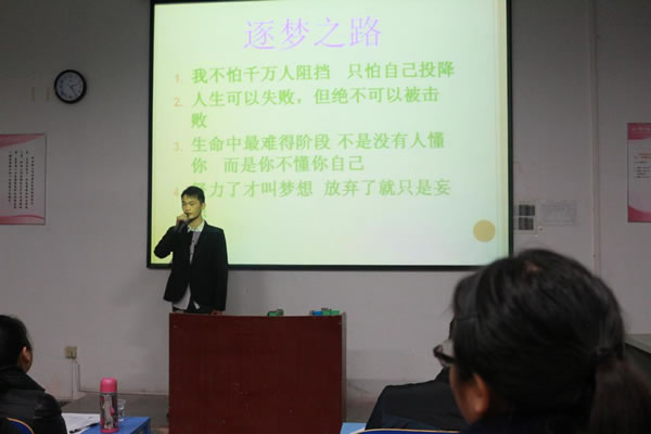 2014年11月30日晚6:00在老医院阶梯二举行第六届大学生《职业生涯规划设计》演讲比赛。本次比赛旨在引导学生树立正确的成才观、就业观和职业规划意识,科学规划自己的职业生涯和学业生涯,为成功打造自己精彩人生做应有的准备。参赛选手们结合PPT演示文稿对自我认识和外部环境进行了分析,提出了自己的职业目标,发展途径和行动规划,并对其可实施性提出了相关阐述。最后由社科部谈寂教授对同学的演讲进行点评,提出存在的一些不足点,并寄予希冀愿进入学校决赛的同学表现更进一步!