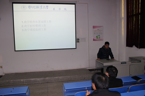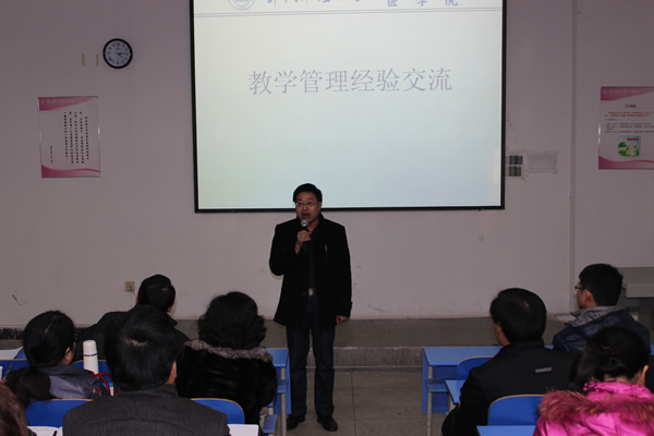 为增进我校院系(部)间学习交流,进一步提高院系(部)教学管理水平和全校教学质量,校教务处于2014年12月5日下午4:00在医学院弘德楼举行教学检查典型经验交流现场会,本次会议由校教务处主办,我院承办。校教务处副处长方明亮同志主持会议,教务处处长杨殿生同志作了关于加强教学管理工作的重要讲话,校教务处副处长李雄洲同志、各院系院长(主任)、教学副院长(副主任)、教研室主任、教学秘书近80人参加了本次交流会。