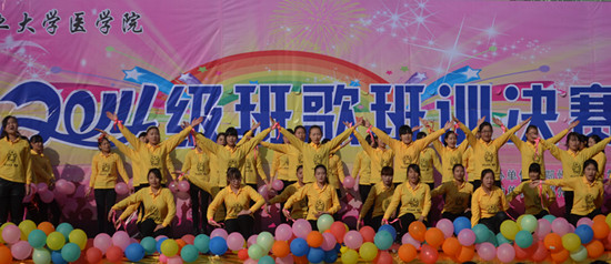 11月6日下午,医学院14级班歌班训比赛决赛在求真楼前举行,副校长周岫和近千名师生观看了表演。