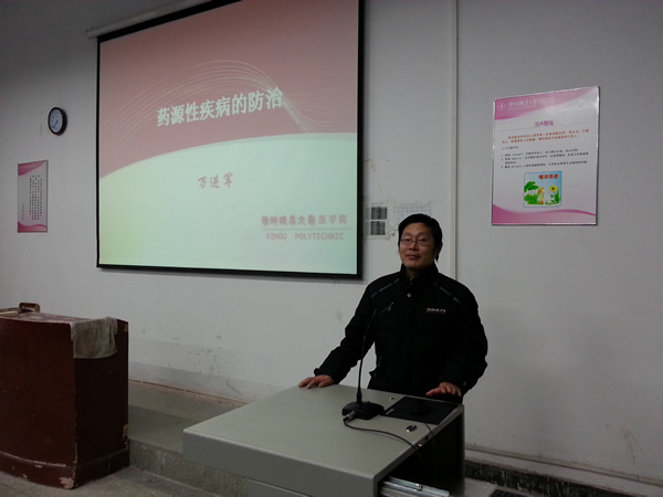 2014年12月18日晚19点在四号教学楼202教室,药学教研室万进军老师,做了题为《药源性疾病的防治》的讲座,医学院近200名学生参加了此次讲座。