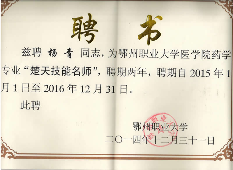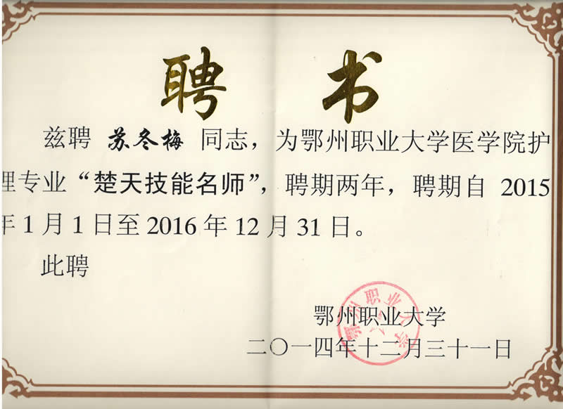 经湖北省教育厅批准,我院2015年二位楚天技能名师受聘上岗。苏冬梅,鄂州中心医院主任护师,教授,受聘于我院护理专业楚天技能名师,聘期二年,从2015年1月至2016年12月。杨青,武汉百艾康文化推广有限公司总经理,教授,受聘于我院药学专业楚天技能名师,聘期二年,从2015年1月至2016年12月。