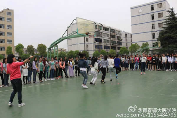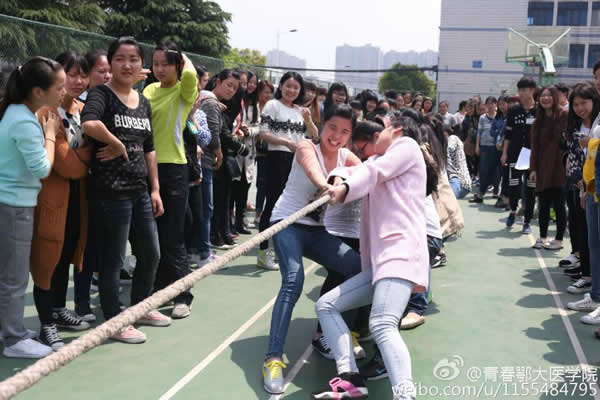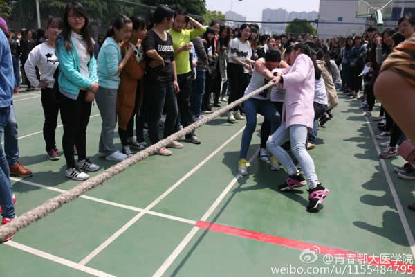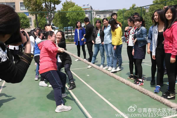 由体育部组织的拔河比赛以班级为单位随机抽签互相比拼。伴随着裁判员的一声长哨双方的队员们手中紧紧握住长绳、口中有节奏的高呼着“一、二”,卯足了劲往后拉,同专业的同学们在旁加油助威。双人背靠背的“爆气球”、五人一组的“跳大绳”、小组围圈的“踢毽子还有考验反应力的“抢板凳”游戏,让同学们个个精神抖擞地参入到游戏中。