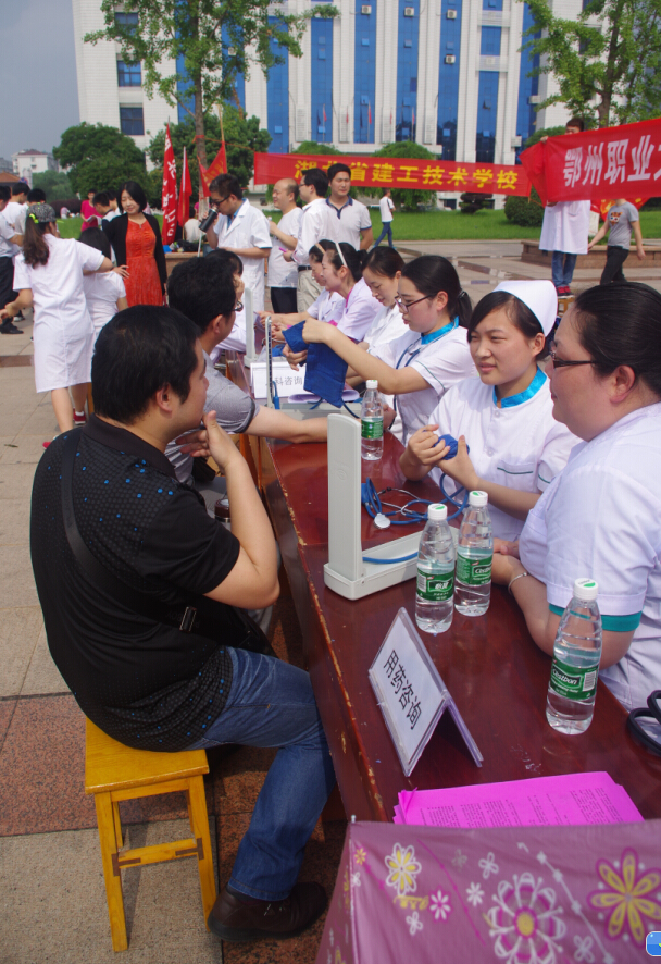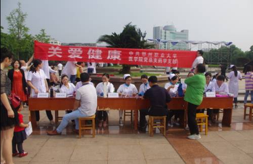 为深入推进创建“服务型”党支部,2015年5月16日星期六上午,鄂州职业大学医学院药学支部组织党员师生来到凤凰广场开展健康卫生咨询活动,为市民义诊送健康,增强市民的健康意识,排除市民疾病隐患。
