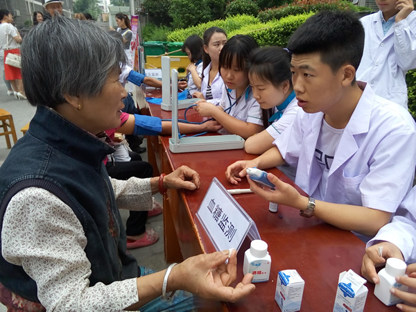 党员师生为社区居民提供血压监测、血糖监测、身高体重监测、用药咨询等服务。活动中,前来问诊、量血压、测血糖的社区居民络绎不绝,党员师生们耐心地解答广大群众的各种健康咨询,并对中老年常见慢性疾病的日常饮食和用药注意给出了专业的建议。