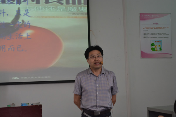 杨教授的讲座内容分为五部分。首先,杨教授向师生们介绍了转基因食品的起源和定义。转基因食品,就是指科学家在实验室中,把动植物的基因加以改变,再制造出具备新特征的食品种类。所有生物的DNA上都写有遗传基因,它们是建构和维持生命的化学信息。通过修改基因,科学家们就能够改变一个有机体的部分或全部特征。并告诉大家,世界上第一种基因移植作物是1983年培植成功的一种含有抗生素类抗体的烟草植株,过了十年,第一种市场化的基因食物在美国出现,就是可以延迟成熟的番茄作物。第二部分简单的介绍了我国转基因食品的来源,主要依赖进口,没有核心专利。第三部分详细介绍了转基因的利与弊,既解决了粮食问题,又提升了粮食作物的附加值;但转基因食品不安全,容易造成新的疾病。第四部分介绍了转基因食品,安全问题受到质疑,违背了自然发展的规律。但在现实生活中,国家可以通过加强流通领域中转基因食品的管理,完善转基因食品安全管理的法规来规避,如转基因标识。第五部分阐述了如何认识转基因食品安全性鉴别要点,一要看季节,比如反季节冬枣;二看色彩,如彩色馒头;三尝味道,如甜玉米。经过杨院长的精彩讲解,大家都明白了生活中的转基因食物种类。如,西红柿、大豆、大米、土豆等。在美国,转基因食品高达4000多种。