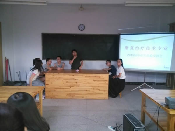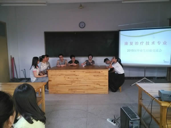 为了让在校学生更好的了解康复治疗技术专业学生就业前景、康复治疗技术专业学生 在校该学什么、学生顶岗实习应该如何做人做事。2015年6月11日19:00,康复治疗技术教研室在弘德楼703教室召开了2015届康复治疗技术专业毕业生经验交流会,参加此次会议的有康复治疗技术专业2015届毕业生代表30余人和康复治疗技术专业2013级、2014级全体学生。