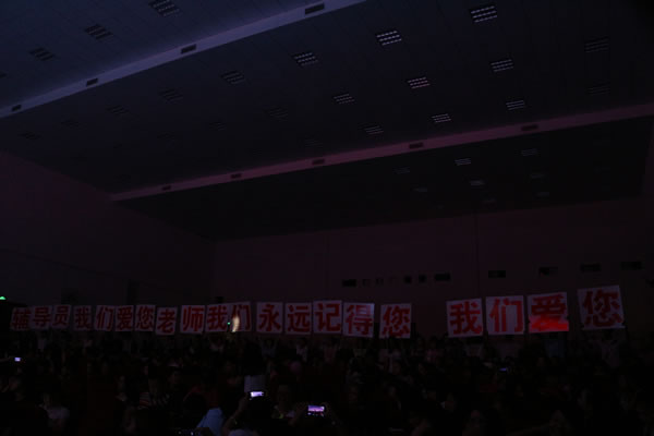 晚会在歌伴舞《中华炫起来》节目中拉开序幕,告诉同学们一个历经沧桑、灾难深重的中华民族,今天依然挺立在世界东方。滔滔江河水,淹不尽浩浩中华魂,巍巍昆仑山,锁不住阵阵中华风,我们将把伟大的祖国建设得更加繁荣富强!情景剧《同桌的你》、朗诵《毕业了,曾经的我们》重温了同学间的友情和师生情。全体专兼职辅导员的朗诵《你还记得吗》和歌曲《时间都去哪儿了》表达了老师对学生的依依不舍情和深深的祝福。台下的学生们也打出了“老师我们爱您、辅导员我们爱您、我们永远记得您”的口号,把晚会推向了最高潮。许多毕业生哭着说:“老师,我不想毕业了!”。最后带着所有的祝福在班歌班训《向快乐出发》的音符中拉下了欢送会的帷幕。