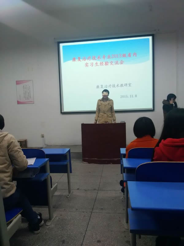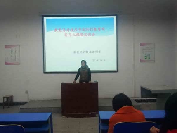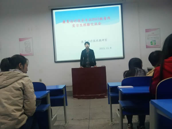 为了让在校学生更好的了解临床上对康复治疗技术专业学生的素质要求、康复治疗技术专业学生在校该学什么及怎么学、学生顶岗实习应该如何做人做事。2015年11月8日13:00,康复治疗技术教研室在弘德楼202教室召开了康复治疗技术专业2013级省内实习生经验交流会,参加此次会议的有康复治疗技术专业全体教师、2013级省内实习生代表和康复治疗技术专业2014级全体学生、部分2015级学生代表。