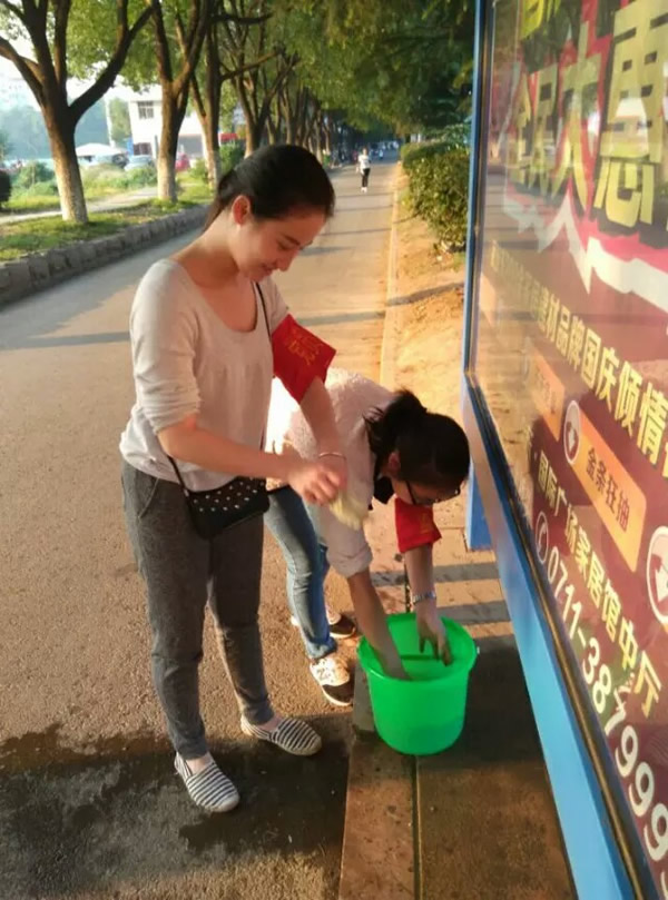 分成各组的同学们都手拿抹布,提着水桶,他们清洗着公交站牌,用自己的微薄之力改善着市民的候车环境,给市民营造了一个美好的候车心情。最后鄂州职业大学周边车站的车站牌都“脱胎换骨”了。