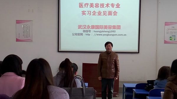 为了使2014级医疗美容技术专业的学生规划2016年的实习工作和职业生涯,2015年12月17日上午10.00,在弘德楼阶梯二多媒体教室,举行了由武汉永康国际美容集团董事长黄国庆主讲的“永康美容 成就人生”的专题讲座,2014级全部学生与2015级部分学生美容专业学生与美容教研室老师近100多人聆听了本次讲座,讲座由医学院院长杨家林主持。黄国庆,妇产科专家背景,湖北省工商业联合会常委、湖北省美容化妆品业商会会长,中国国际美容时尚周(ⅠⅡⅢ届)组委会执行委员、国家职业技能注册高级考评员(美容师、按摩师、推拿针灸师),也是湖北省美容行业第一位也是唯一一位享受国务院津贴的美容行业专家。