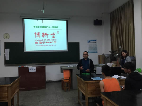2016年4月20日下午14:00,博翰堂国际集团股份有限公司武汉金晚霞分公司在弘德楼203教室特举行招聘见面会,我院2014级药学、药品营销专业学生参加了此次招聘见面会。博翰堂国际集团股份有限公司武汉金晚霞分公司总经理许召聚携客户代表卢桂锡等人亲临现场。