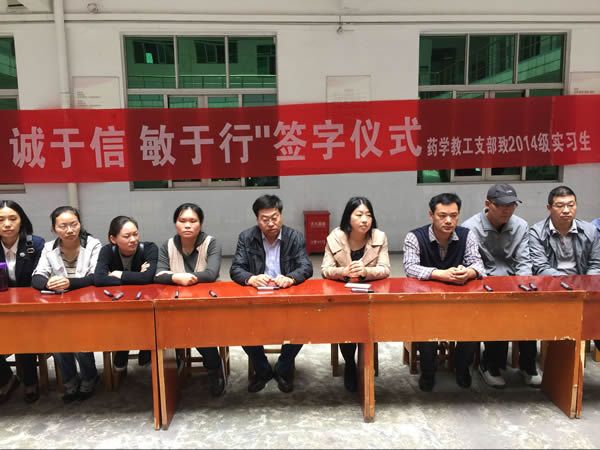 为了让实习生进一步认识顶岗实习的意义,做好顶岗实习的准备,2016年5月28日上午9:00,药学教工支部在医学院为2014级药学专业、药品经营与管理专业特举行“厚于德诚于信敏于行”的诚信签字仪式。2014级药学专业、药品经营与管理专业的实习生参加了此次签字仪式。药学教工支部全体党员、药学教研室老师以及2014级药学专业的辅导员出席了此次活动。