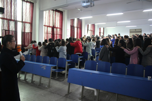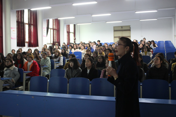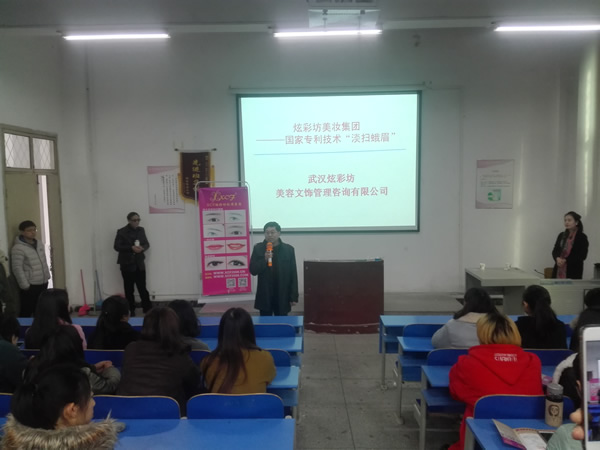 炫彩坊文饰美容集团专职讲师戴老师和叶老师为同学们详细介绍了美容文饰行业的巨大发展前景,鼓励同学们把握机遇,认真做好职业规划,努力成为美容行业高技能人才。武汉美容化妆品行业协会邓福林会长勉励在校同学,珍惜眼前的学习机会,努力将理论知识与实践相结合,给未来的职业生涯打下良好的基础。杨家林院长详细介绍了我院2014级实习生在该公司实习情况,并组织同学们与企业专家进行现场互动和讨论,为同学们答疑解惑。