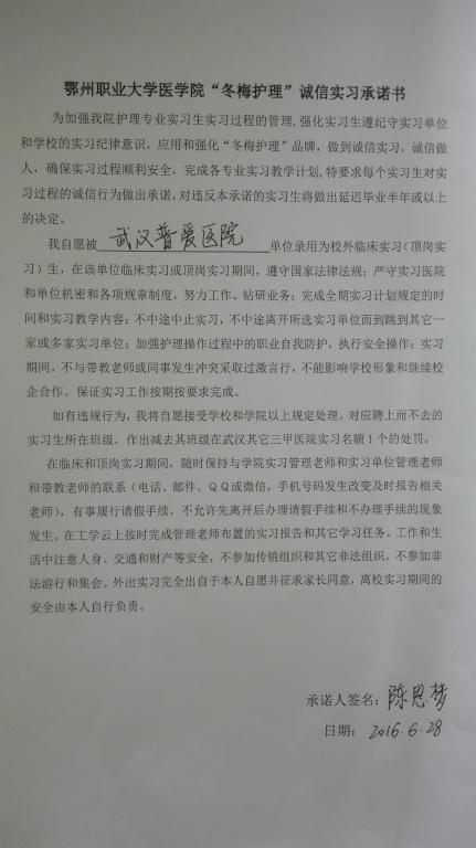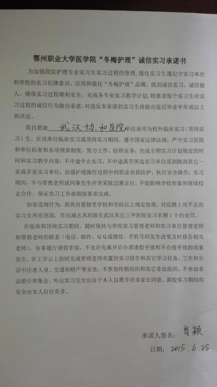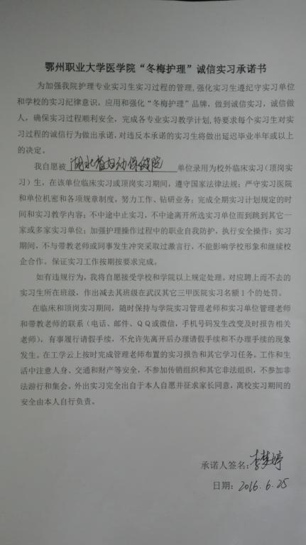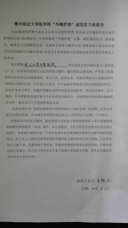 五、“冬梅护理”素质教育践行承诺书