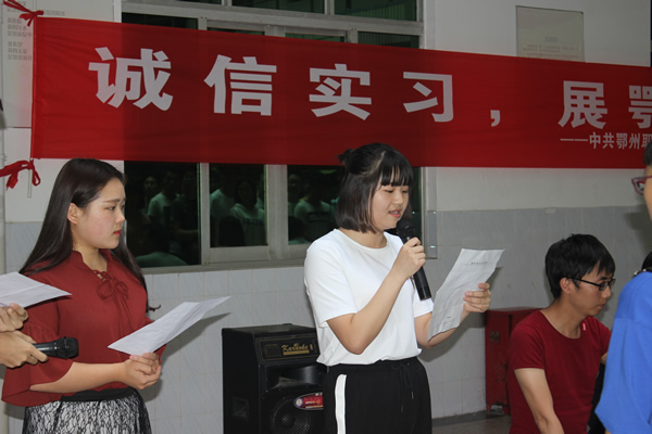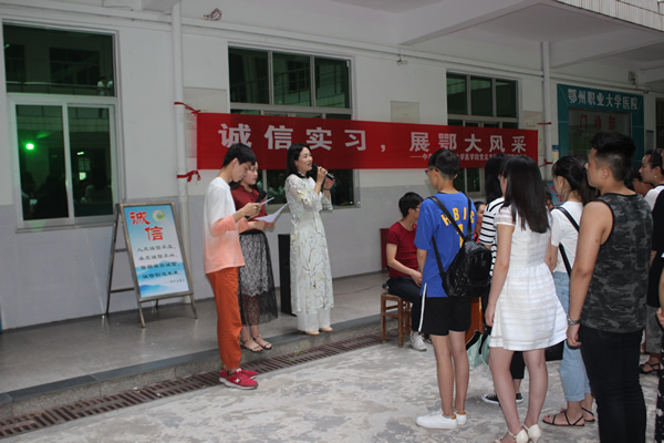 8.活动结束。药学教工支部周先云书记为本次活动作出总结,希望2015级药学专业、药品经营与管理专业的实习生能够在企业里诚信做人,诚实做事,展现一个高素质的当代大学生诚信形象。活动在实习生高声宣读“诚信实习,展鄂大风采”的读声中结束。