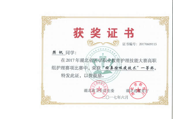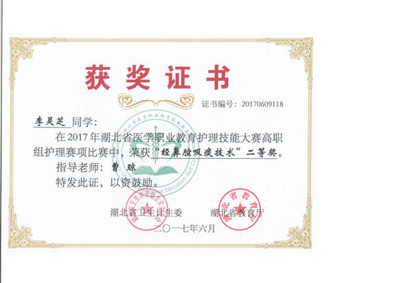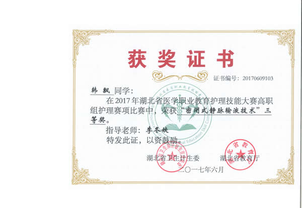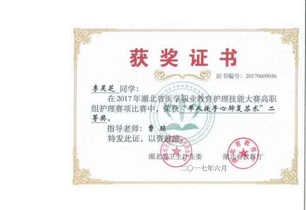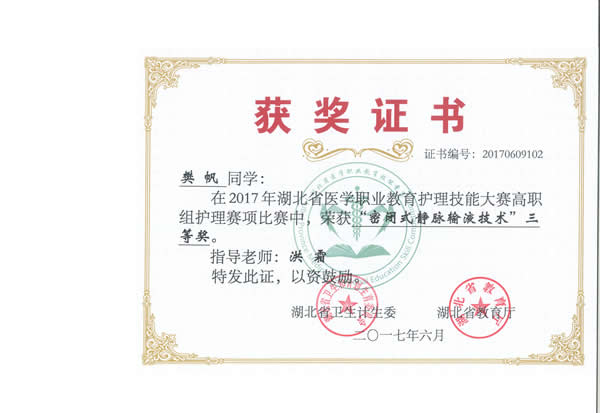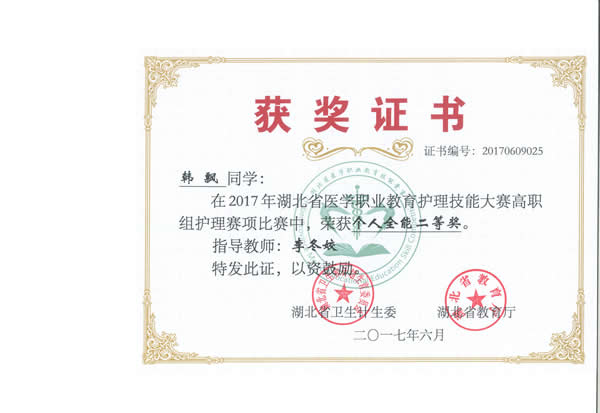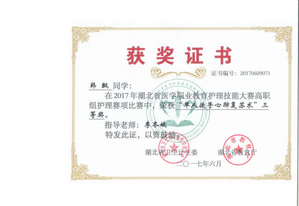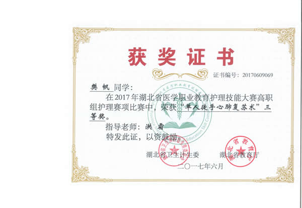 20176911日,由湖北省卫生和计划生育委员会、湖北省教育厅主办的“2017年湖北省医学职业教育护理技能大赛”在湖北职业技术学院举行。我院3名参赛选手韩飘、樊帆、李灵枝参加竞赛并获得了团体二等奖、囊括单项奖12项的好成绩(单项奖和全能奖)。