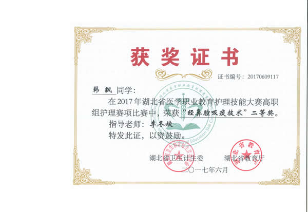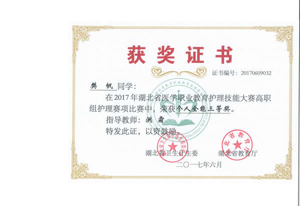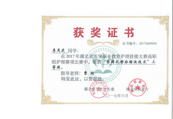 20176911日,由湖北省卫生和计划生育委员会、湖北省教育厅主办的“2017年湖北省医学职业教育护理技能大赛”在湖北职业技术学院举行。我院3名参赛选手韩飘、樊帆、李灵枝参加竞赛并获得了团体二等奖、囊括单项奖12项的好成绩(单项奖和全能奖)。