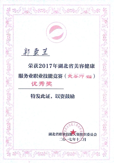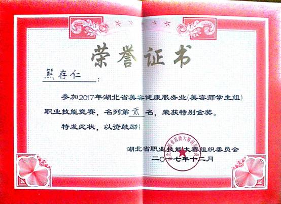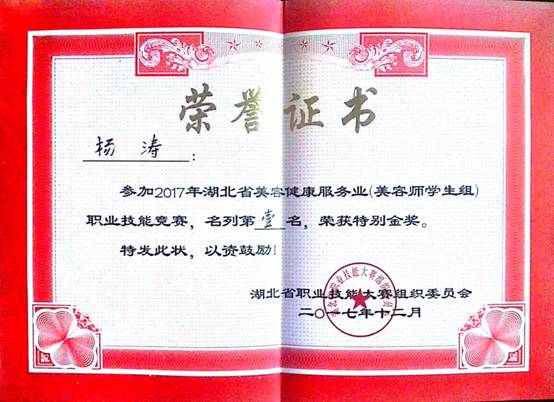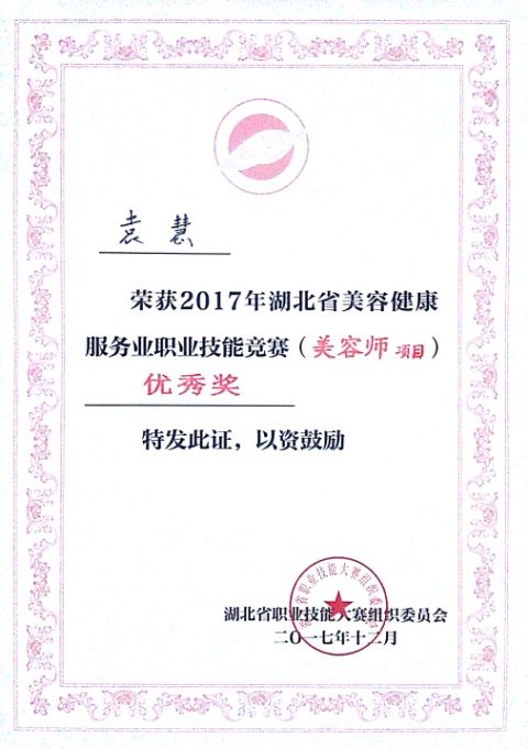 20171212日,由湖北省职业技能鉴定指导中心主办,湖北省美容商会承办的“2017年湖北省美容健康服务业职业技能竞赛”,我校参赛选手取得了优异的成绩:一等奖1名,二等奖1名,三等奖1名,优秀奖3名。