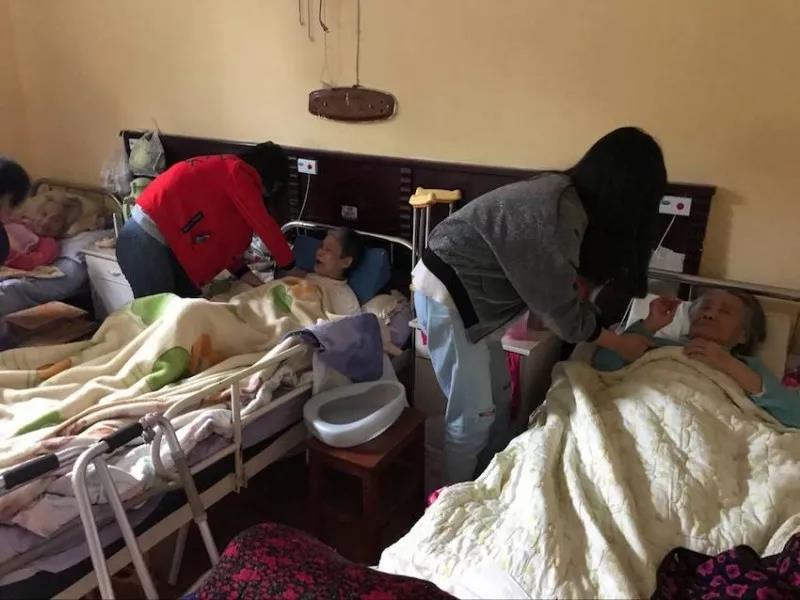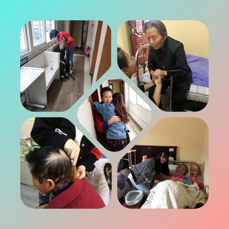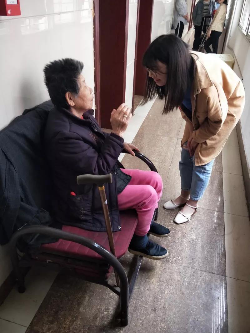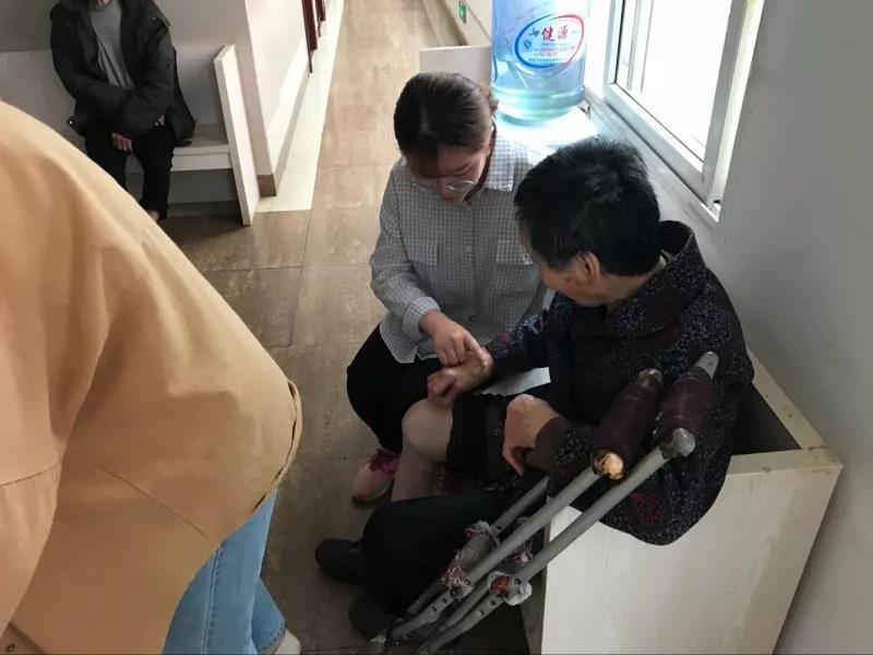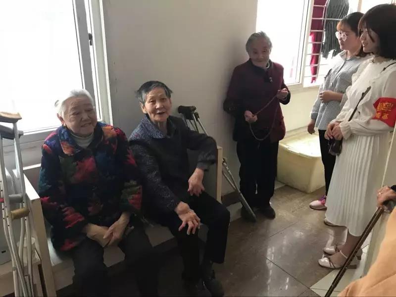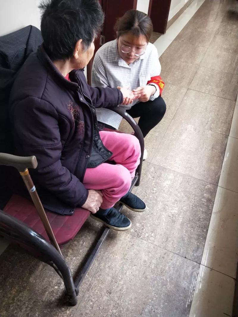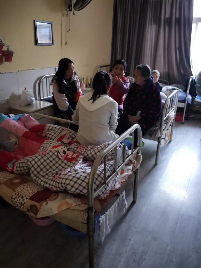 刚到爱心老年公寓,就有一个阿姨和一个老奶奶闻声走了出来,大家纷纷问好。我们被分到了三楼,有一些奶奶在楼道里,拄着拐杖,看到我们很开心,很快,大家分散开来,每个人都进到老人房间去了,陪老人聊天,给老人按摩,洗脚,问候她们在这里的生活。