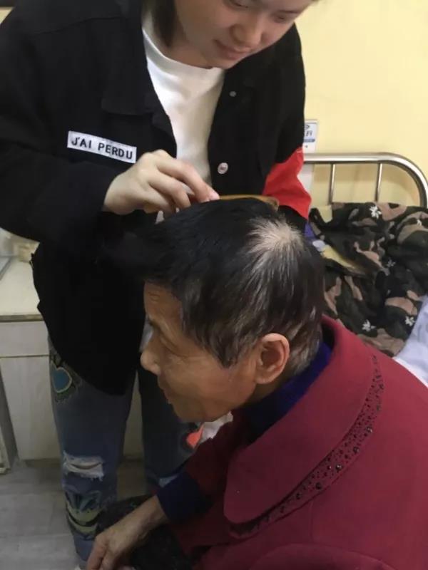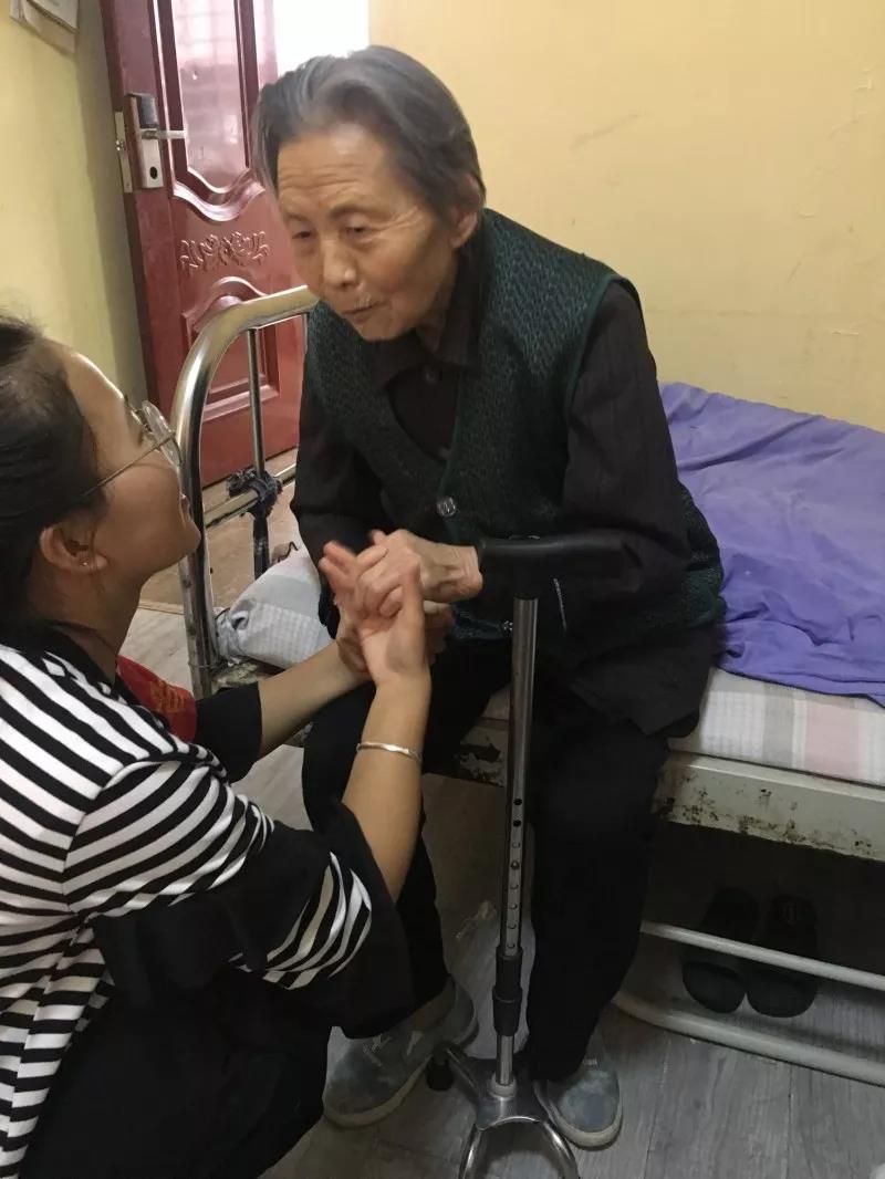 另一个老人,不能走动了,一直躺着床上,我们进去的时候,她努力的抬起头来,跟我们说话,说着"嘉玲,你来了吗"。可能是因为她太想念家人了吧,她握着我们每一个人的手,并且在贴在她脸上蹭来蹭去。这时,我突然觉得,这不是言语能沟通得了的,这是心与心的沟通,她讲什么我可能听不懂,但是她一定挺孤独的,看见这么多人来看她,她一定很开心,用自己最大的力气来握每一个人的手,耄耋之年,她们一定希望自己身边经常有人这样陪着吧。