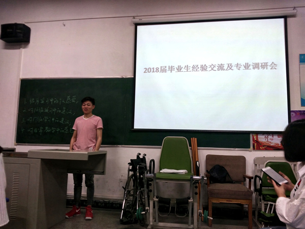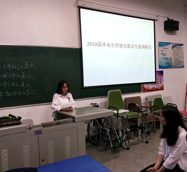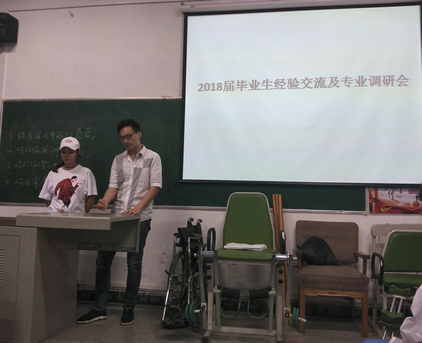 为促进本专业的健康持续发展,完善人才培养模式,实现教学与临床实践的紧密结合,2018年5月12日医学院康疗教研室在弘德楼201教室召开了2018届毕业生经验交流及专业调研会。康疗专业全体教师、18届优秀毕业生代表以及16级、17级康疗专业班委成员,共计40余人参加了会议。