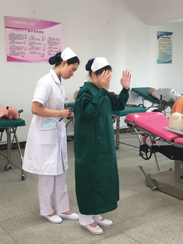 竞赛要求每一名16级参赛选手选择一名17级助产专业新生作为助手,通过16级学生的“传帮带”,两人一组共同完成竞赛项目。在学生准备参赛期间,助产技能实训室全天候开放,供学生训练。