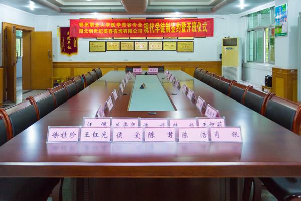 2018年11月15日下午2:30,鄂州职业大学医学美容技术专业与湖北创世纪美容咨询有限公司隆重举行了现代学徒制签约暨开班仪式。学校校企合作处处长李雄舟、医学院院长杨家林等领导,企业董事长李婷及各部门主管出席了本次仪式,参加仪式的还有专业教师和学生。