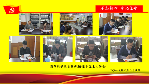 经过前期精心的准备,医学院党总支2018年民主生活会于2019年3月25日在学院会议室召开,会议由医学院党总支书记汪艳霞同志主持,学院总支全体成员参加,学校督导组成员史葳同志到会指导。