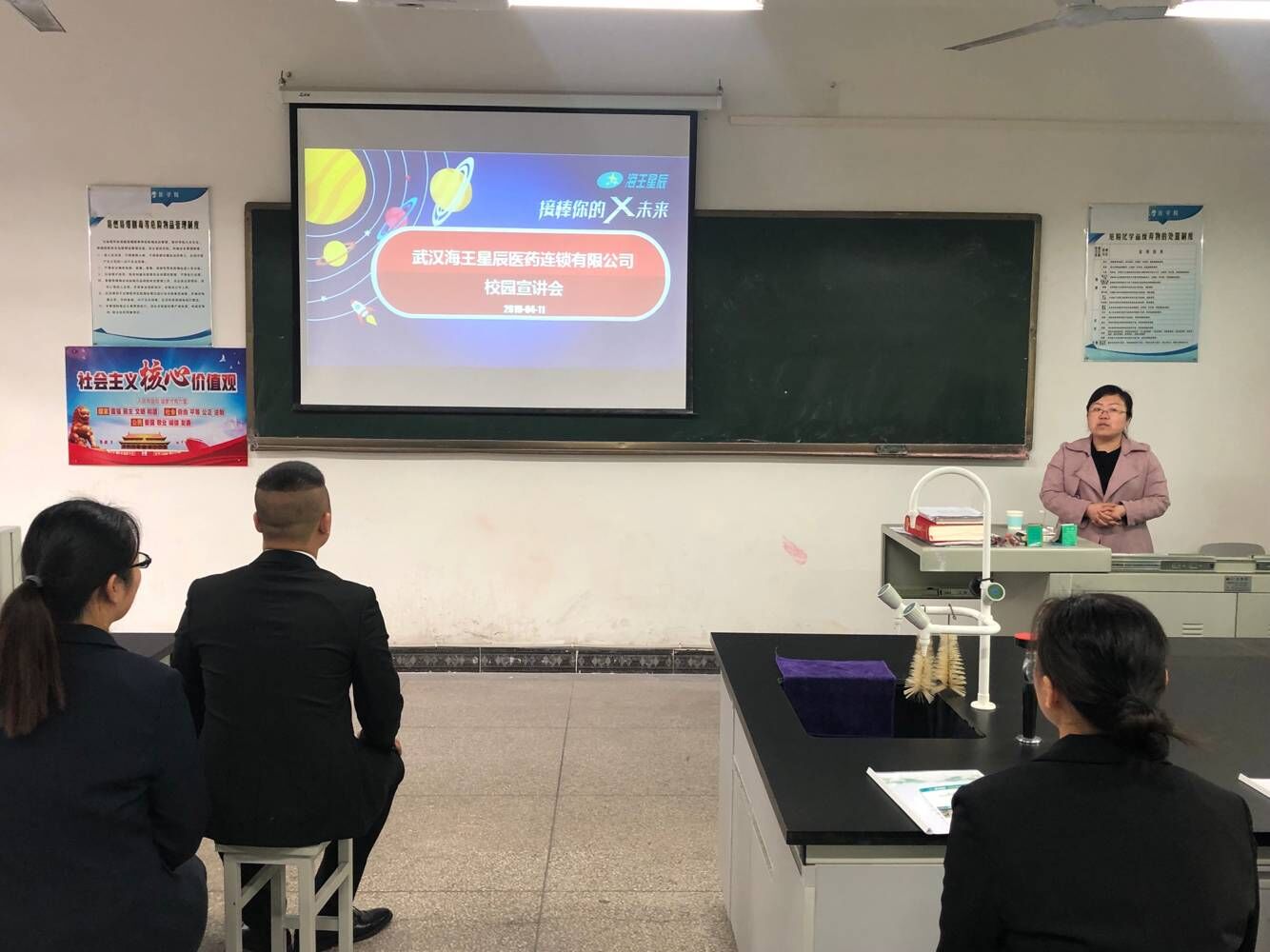 2019年4月11日,武汉海王星辰连锁有限公司在弘德楼602教室特举行“海王星辰”招聘见面会,我院2017级药学专业、医药营销专业学生参加了本次招聘会。海王药业有限公司人事经理田红雪、营业部专员肖艳丽(我院2012级药学专业毕业生)莅临我院,田红雪主持了本次招聘见面会。