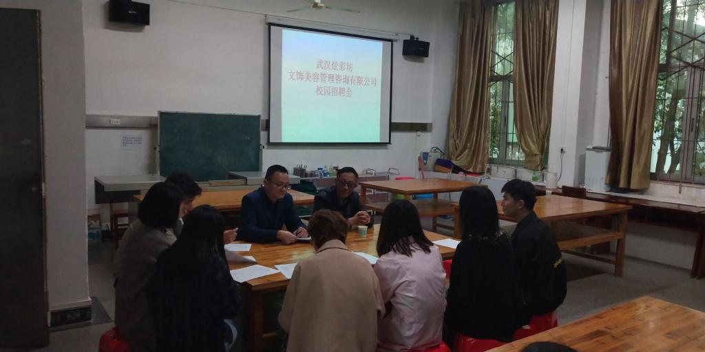 2019年4月11日,炫彩坊纹饰美容管理咨询有限公司在弘德楼204教室特举行“炫彩坊”招聘见面会,我院2017级医学美容专业学生参加了本次招聘会。湖北美容商会副会长邓福林、炫彩坊公司董事长祝兵,莅临我院,祝兵董事长主持了本次招聘见面会。