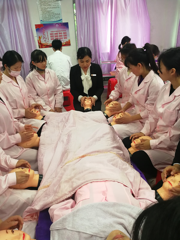 2019年4月18日下午,在医学院弘德楼101教室,医学美容技术专业现代学徒制创世纪班学生在企业导师韩梅老师指导下,进行面部按摩基本手法实训学习。