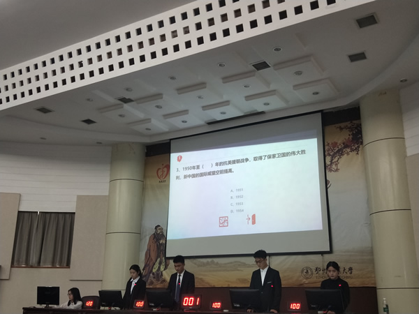 经过各学院初赛,复赛的层层选拔,个人赛选手有孙玉秀,杨靓雯,贾德恩,黄志成。团体赛有商学院代表队,建筑工程学院代表队,电子电器工程学院代表队以及医学院代表队。这次比赛共分为必答题,抢答题,风险题三个环节。