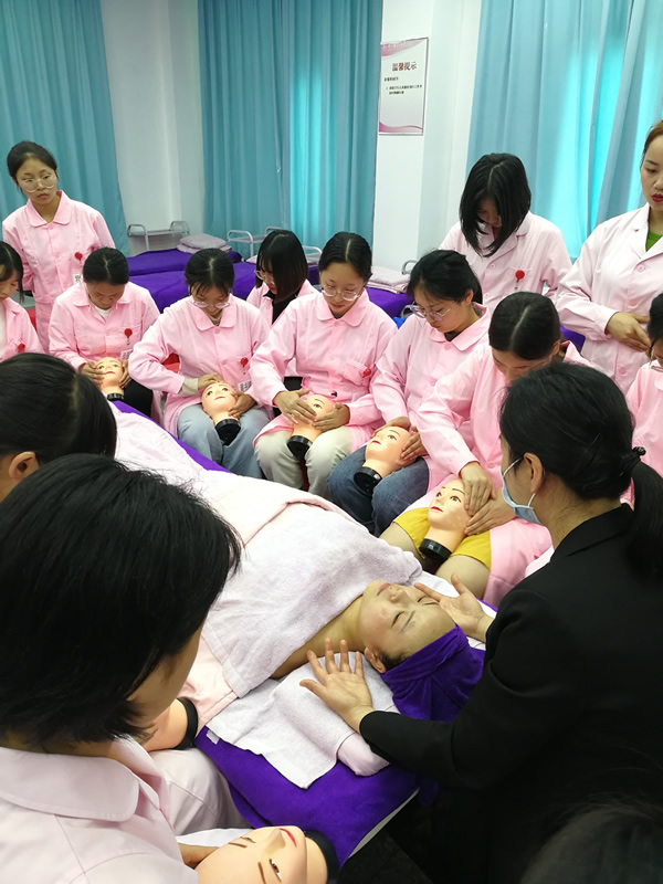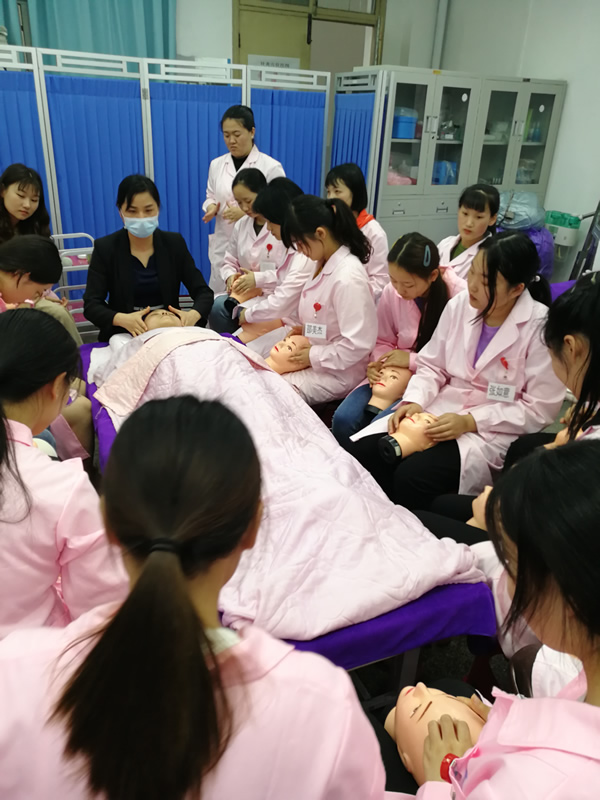 2019年5月17日下午2:00,在医学院弘德楼101美容实训室,医学美容技术专业现代学徒制创世纪班学生在创世纪班导师指导下,进行了面部护理理论知识学习和面部按摩手法实训练习。