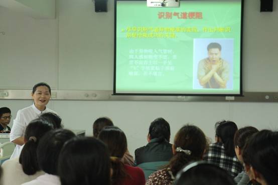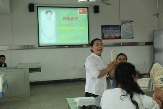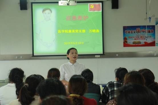 2019年5月19日上午9:00,医学院康美党支部书记万晓燕同志、副书记谢义群同志为我校41名学生宿舍管理员开展应急救护普及培训活动。培训活动的内容是气管异物梗阻的急救和创伤的救护,培养舍管员的应急救护能力。