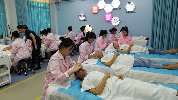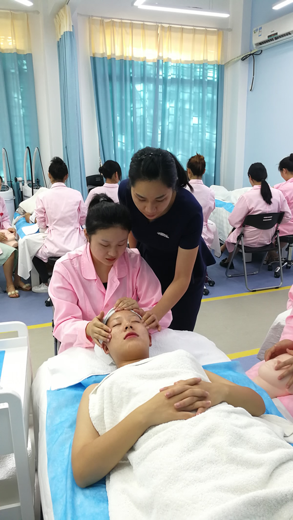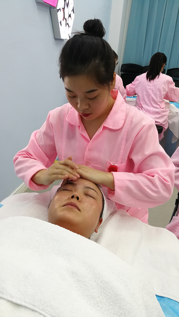 2019年9月19日下午2:00,在医学院弘德楼103“创世纪美容实训室”,医学美容技术专业创世纪现代学徒制班学生在企业导师指导下,对上学期所学面部按摩手法进行回顾并练习。