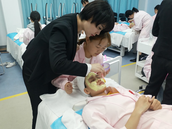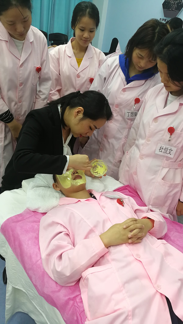 课程最后是面膜的敷卸教学,企业老师先示范操作,学生们再分组互相练习,课堂学习氛围浓厚。