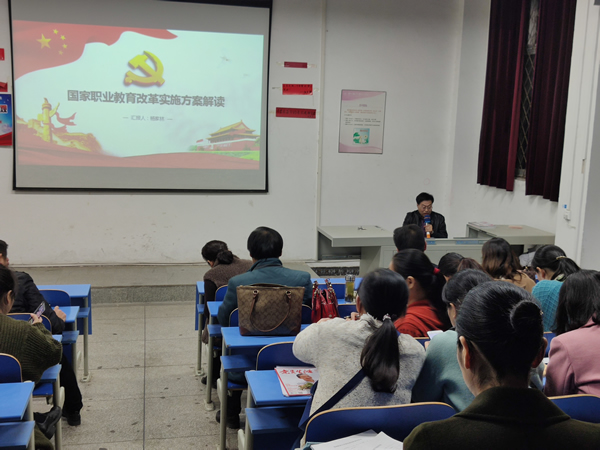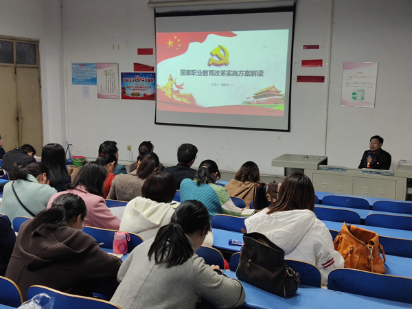 杨院长从《国家职业教育改革实施方案》对职业教育的定位和重要作用方面对《国家职业教育改革实施方案》进行了详细的解读,并分析了我院新形势下发展面临的机遇和挑战,要求大家“不忘初心、牢记使命”,发扬奋斗精神,主动担当作为,以饱满的政治热情、良好的精神状态、务实的工作举措努力推进“职教二十条”在学院各项工作中落实落细。
