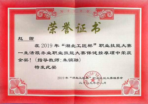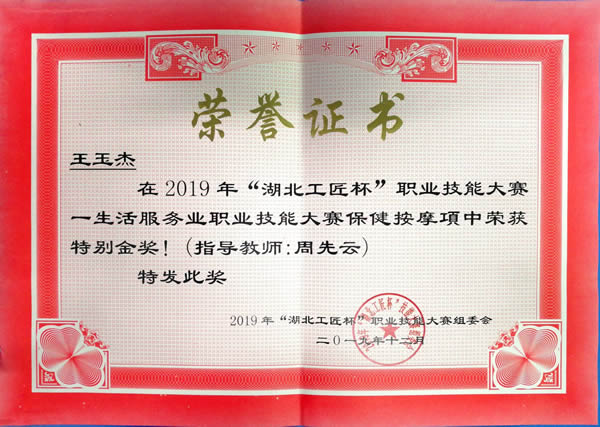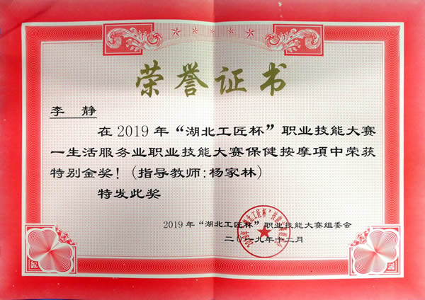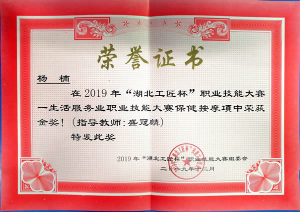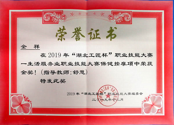 12月4日,由湖北省商务厅、湖北省人力资源和社会保障部主办的2019年“湖北工匠杯”技能大赛——生活服务业(保健按摩)职业技能大赛在武汉开赛,我校2018级医学美容技术专业王玉杰、杨楠等八名同学参加了此次比赛。