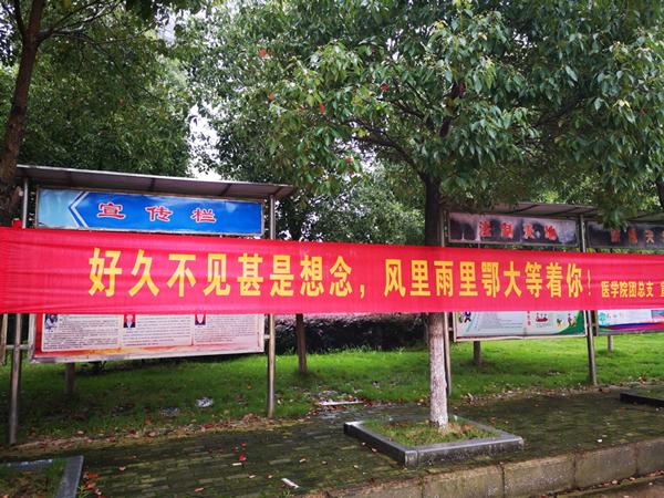 当同学们缓缓走向宿舍楼,映入眼帘的是一条条鲜明的横幅:“好久不见甚是想念,风里雨里鄂大等着你!”、“日夜兼程只为迎接你,欢迎同学们回家!”。顺着回宿舍的路,看到一句句温暖的话语,一股暖流涌上心头。许久不见的辅导员们早已值守在宿舍楼的门口,负责给学生及家长进行消毒、测量体温、分发爱心餐等工作,同时叮嘱同学们实习注意事项。不论是骤雨狂风还是骄阳之下,辅导员们尽职尽责的守在宿舍楼下,直到傍晚时分夜幕降临,还需对当日应到校、实到校、已离校的学生人数每日一汇总,做到心中有数。