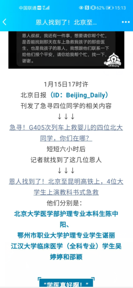 急寻G405次车上救婴儿4位大学生#最新进展!已确认4位医学生中有一位是来自鄂州职业大学医学院2018级护理12班谌丽同学。据媒体此前报道,1月12日晚, 北京开往昆明的G405次列车上, 这位来自鄂州职业大学的同学参与了救治一名6个月大的婴儿。