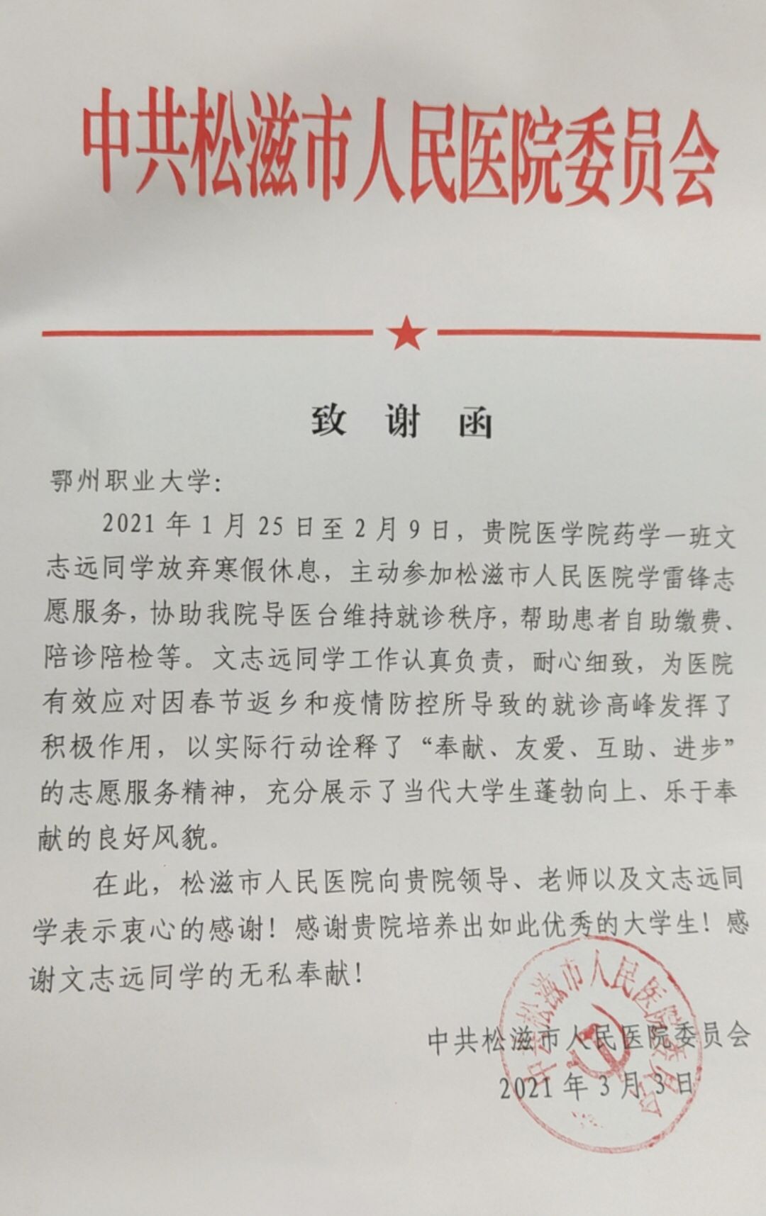 学院收到了一封特殊的“感谢信”。这封感谢信是松滋市人民医院写给我院2020级药学1班的文志远同学的。他并不是什么“大人物”,而是奔忙在抗疫一线的当代大学生。他于2021年1月25日至2月9日,利用寒假时间,主动参加松滋市人民医院志愿服务,协助该医院导医台维持就诊秩序,帮助患者自助缴费、陪诊陪检等。
