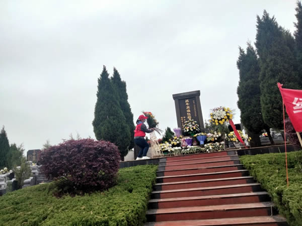 上午八点左右到达殡仪馆,在馆长的带领下来到了烈士陵园,祭拜了英雄赵怡忠。大家怀着悲痛而沉重的心情站在赵怡忠烈士的墓前,缅怀为祖国的解放和人民的安宁而英勇牺牲的战士,瞻仰他的丰功伟绩。烈士陵园是那么庄严、肃穆,使人不由得肃然起敬。大家按要求排好了整齐的队伍,然后认真地聆听主持人致词,了解革命历史、学习弘扬革命精神。在主持人讲完致辞之后,每人手捧一束鲜花,围绕着英雄的墓走了一圈并敬献鲜花,在参观途中发现了一位老奶奶似乎在找什么,于是走上前询问是否需要帮忙,奶奶说她在找母亲的墓碑,因为大多数墓碑上的字已经不太清楚了,所以找起来有些困难,需要帮忙一起找。然后大家分开行动,很快就帮她找到了母亲的墓碑,将奶奶带到墓前。队伍接着继续在陵园路上走着,发现有的墓碑前的鲜花倒了或者歪了就上前扶正,从他们墓前走过,仿佛接受了人生的洗礼。