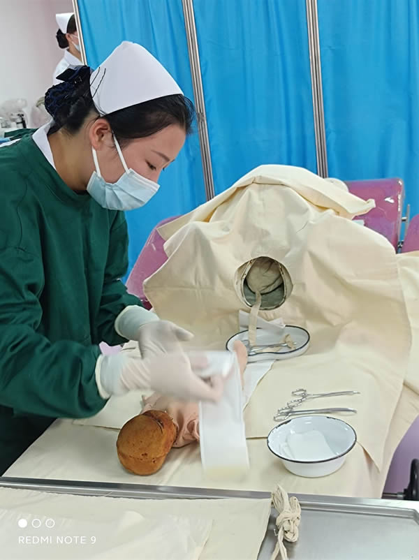 竞赛要求每一名19级参赛选手选择一名20级助产专业新生作为助手,通过19级学生的“传帮带”,两人一组共同完成竞赛项目。在学生准备参赛期间,助产技能实训室全天候开放,供学生训练。